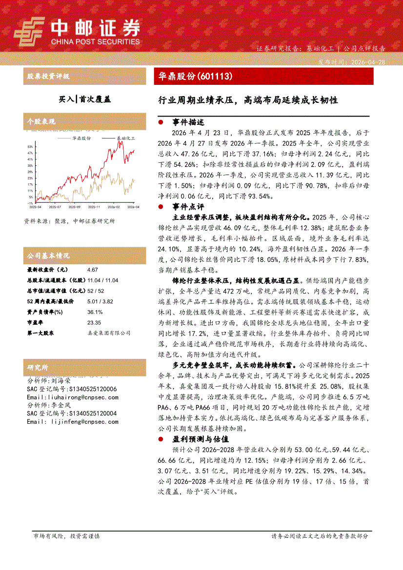 华鼎股份:中邮证券-华鼎股份-601113-行业周期业绩承压,高端布局延续成长韧性-260428