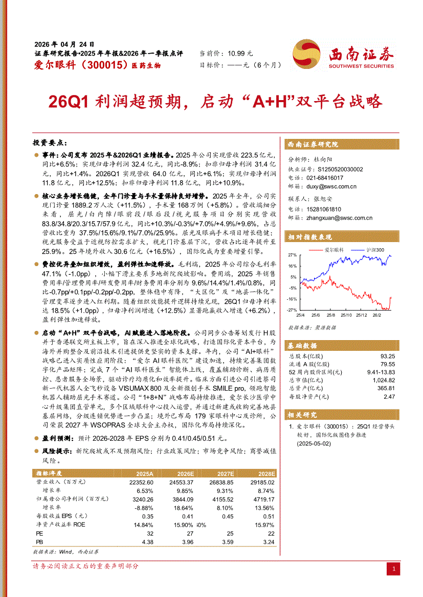 爱尔眼科:西南证券-爱尔眼科-300015-26Q1利润超预期,启动“A+H”双平台战略-260424