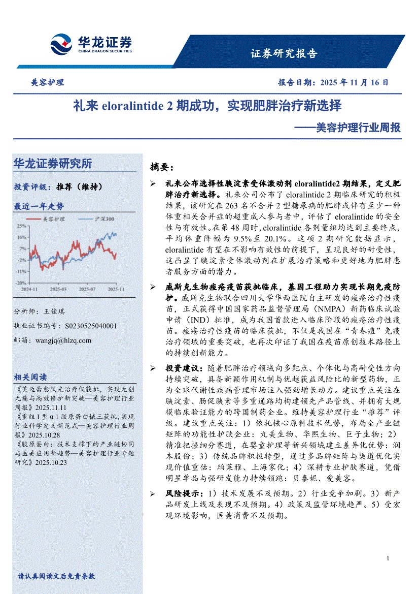 美容护理行业:华龙证券-美容护理行业周报:礼来eloralintide 2期成功,实现肥胖治疗新选择-251116