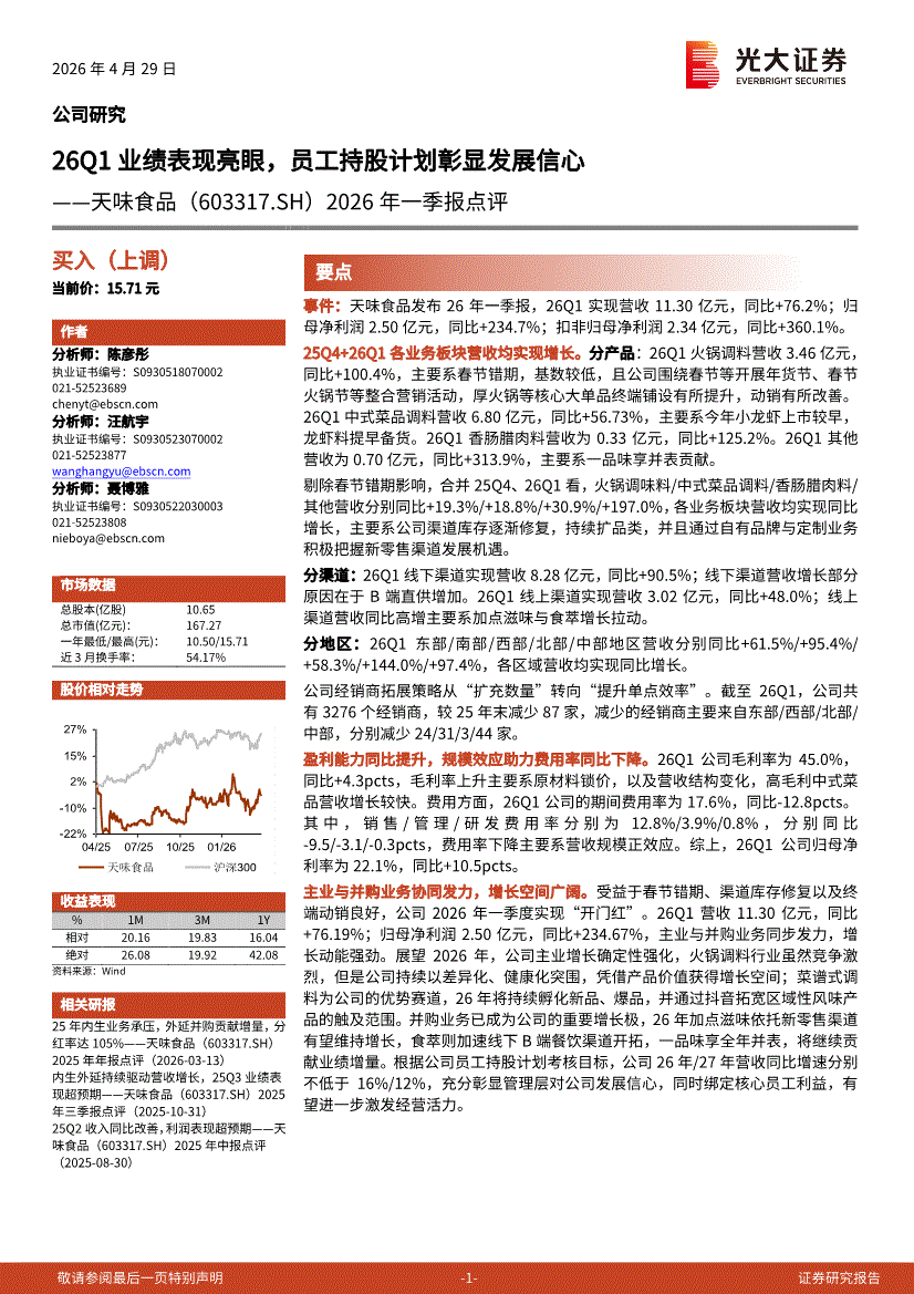 天味食品:光大证券-天味食品-603317-2026年一季报点评:26Q1业绩表现亮眼,员工持股计划彰显发展信心-260429