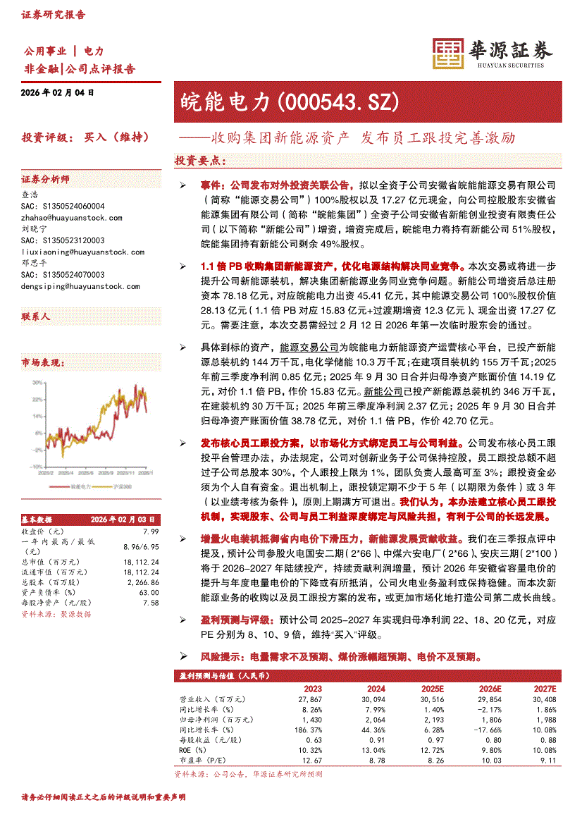 皖能电力:华源证券-皖能电力-000543-收购集团新能源资产,发布员工跟投完善激励-260204