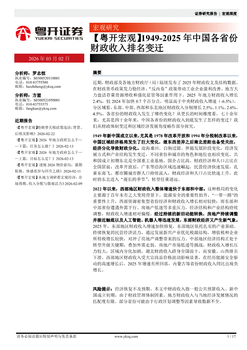 粤开证券-【粤开宏观】1949~2025年中国各省份财政收入排名变迁-260302