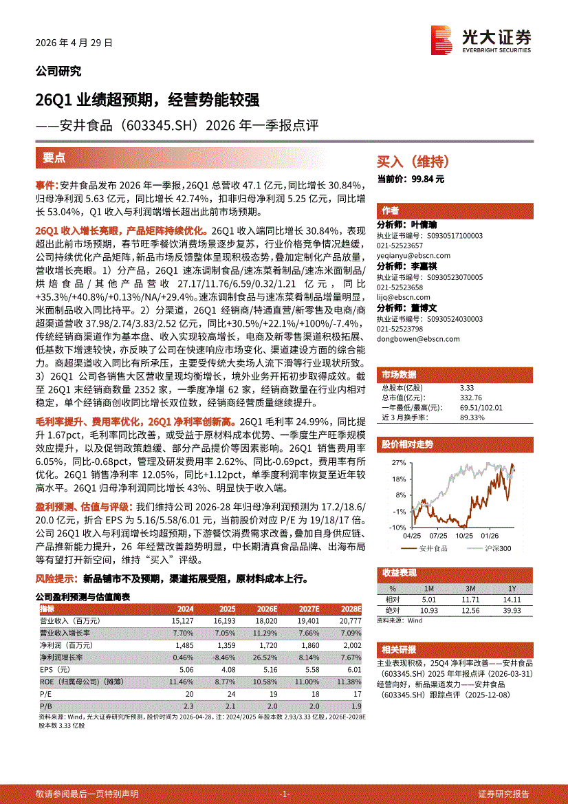 安井食品:光大证券-安井食品-603345-2026年一季报点评:26Q1业绩超预期,经营势能较强-260429