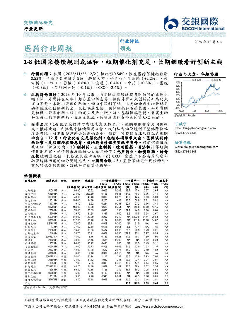 医药行业:交银国际-医药行业周报:1~8批国采接续规则或温和,短期催化剂充足,长期继续看好创新主线-251204