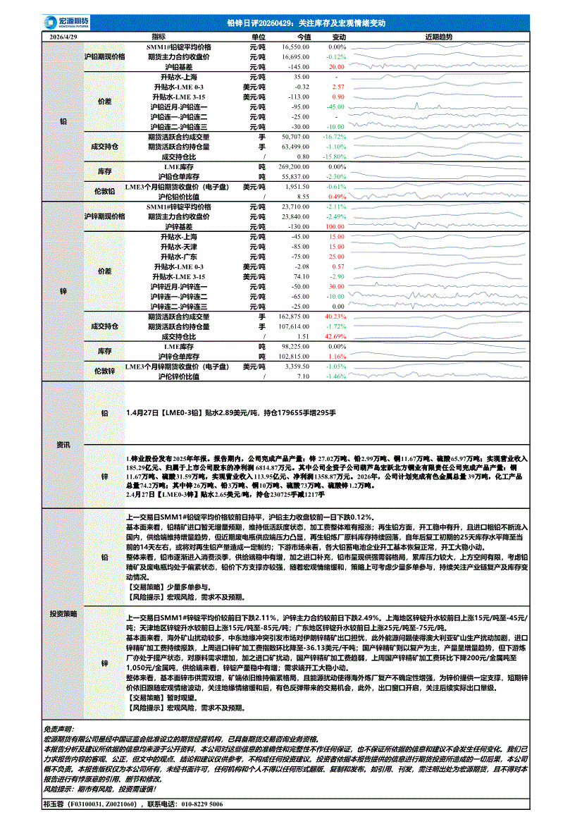 宏源期货-铅锌日评:关注库存及宏观情绪变动-260429