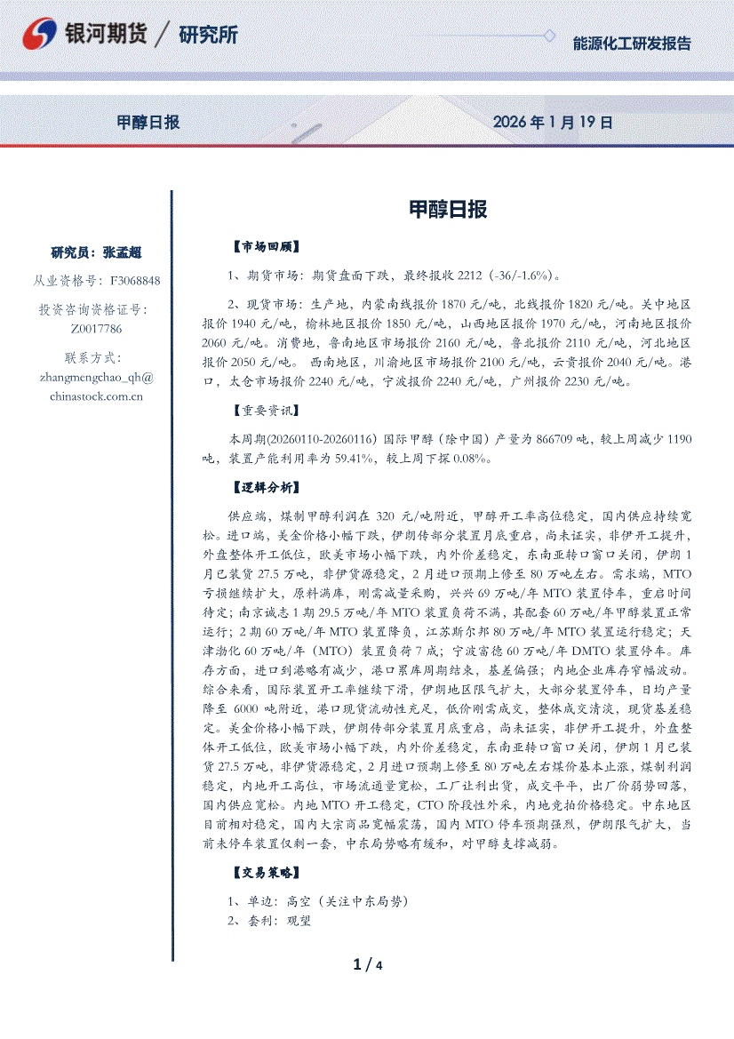 银河期货-甲醇日报-260119