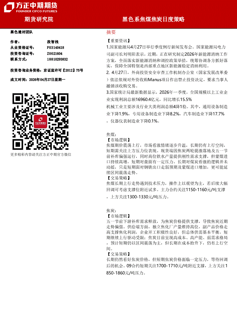 方正中期期货-黑色系焦煤焦炭日度策略-260427