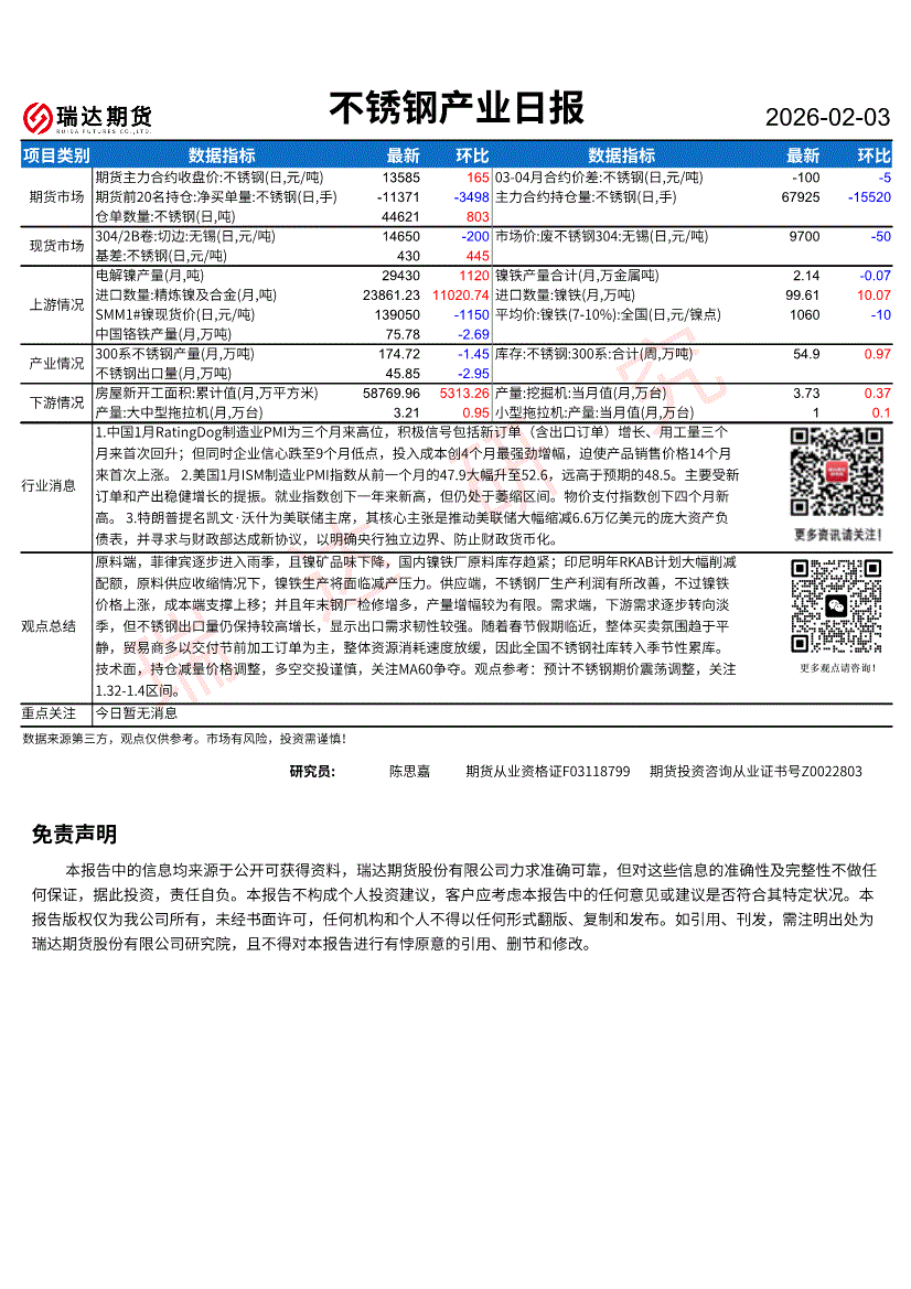 瑞达期货-不锈钢产业日报-260203