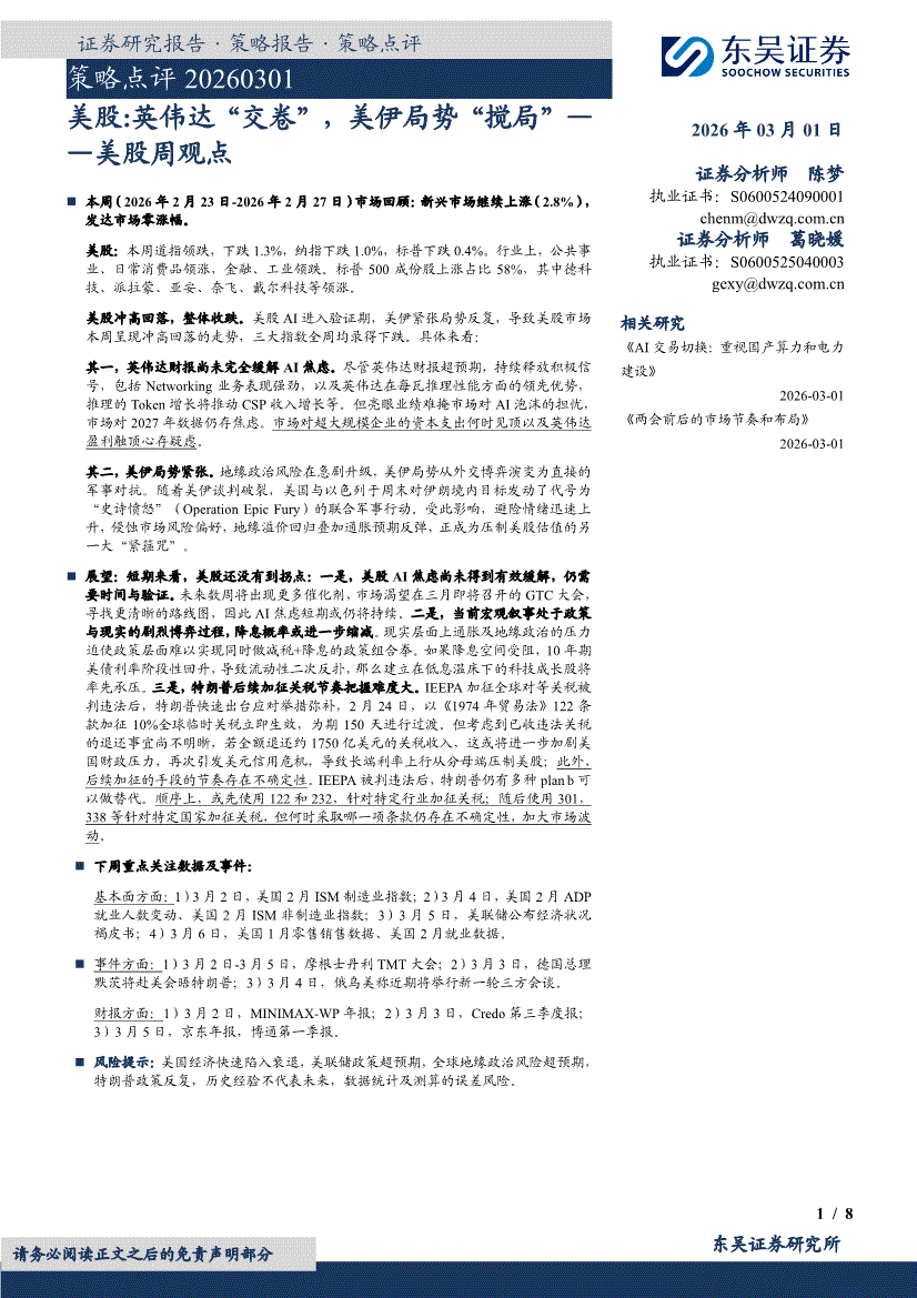东吴证券-策略点评:美股,英伟达“交卷”,美伊局势“搅局”——美股周观点-260301