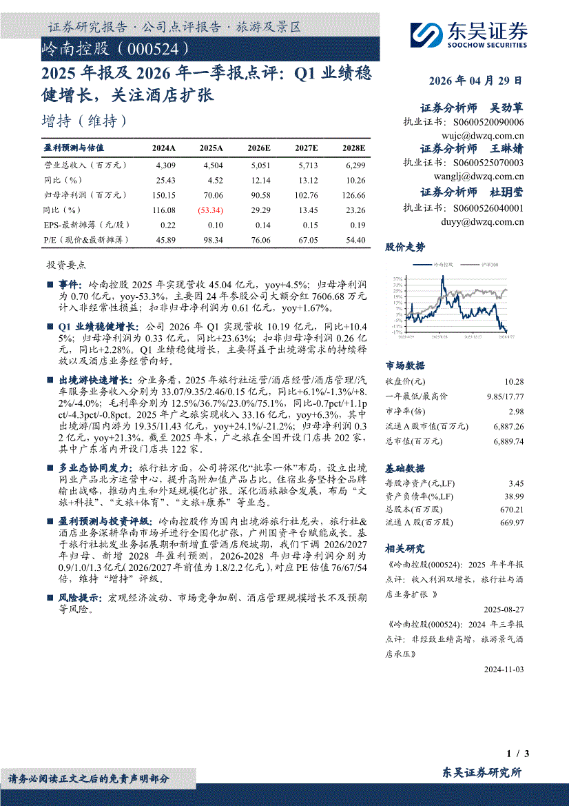 岭南控股:东吴证券-岭南控股-000524-2025年报及2026年一季报点评:Q1业绩稳健增长,关注酒店扩张-260429