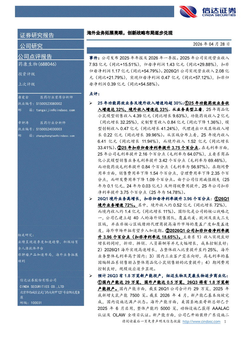 药康生物:信达证券-药康生物-688046-海外业务拓展亮眼,创新战略布局逐步兑现-260428