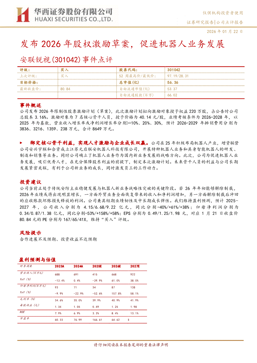 安联锐视:华西证券-安联锐视-301042-事件点评:发布2026年股权激励草案,促进机器人业务发展-260122
