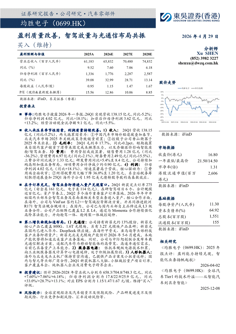 均胜电子:东吴证券(香港)-均胜电子-0699.HK-盈利质量改善,智驾放量与光通信布局共振-260429