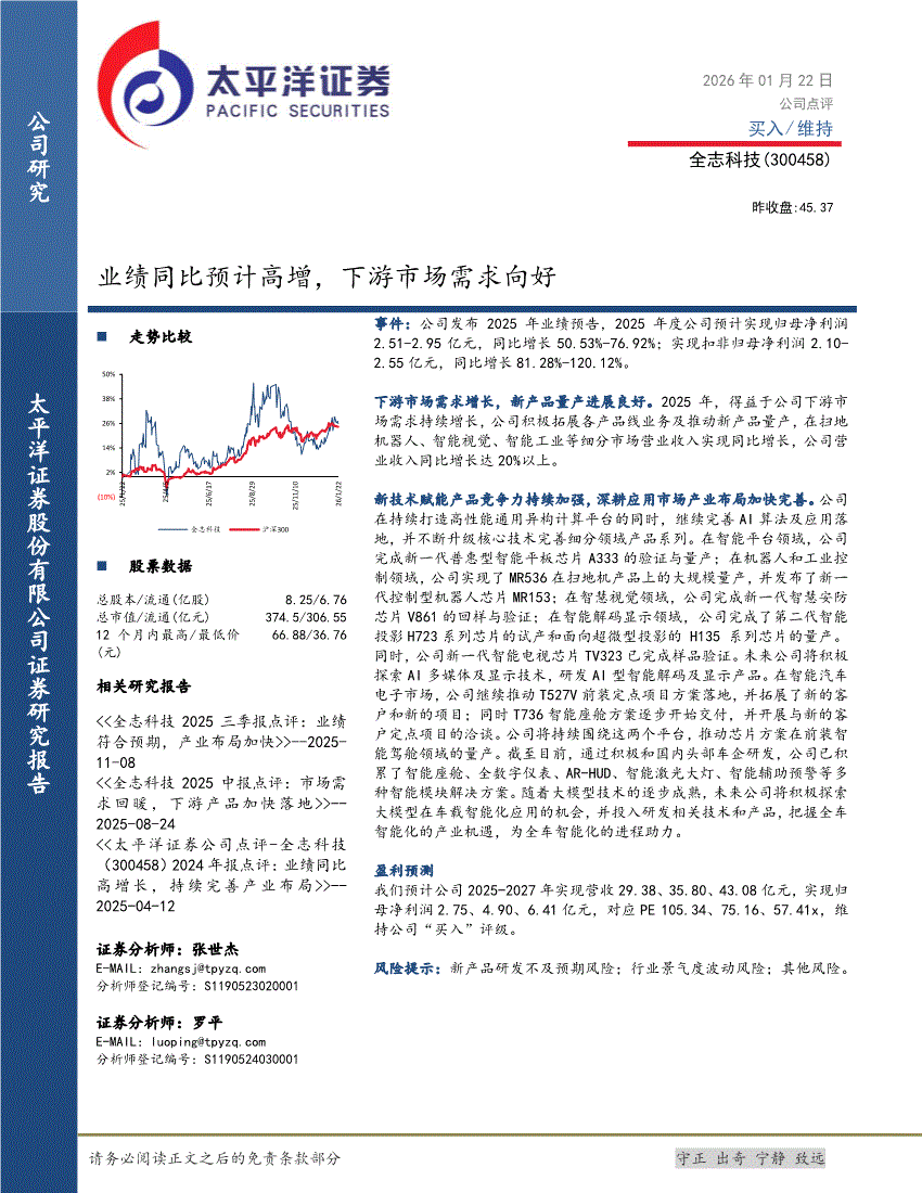 全志科技:太平洋证券-全志科技-300458-业绩同比预计高增,下游市场需求向好-260122