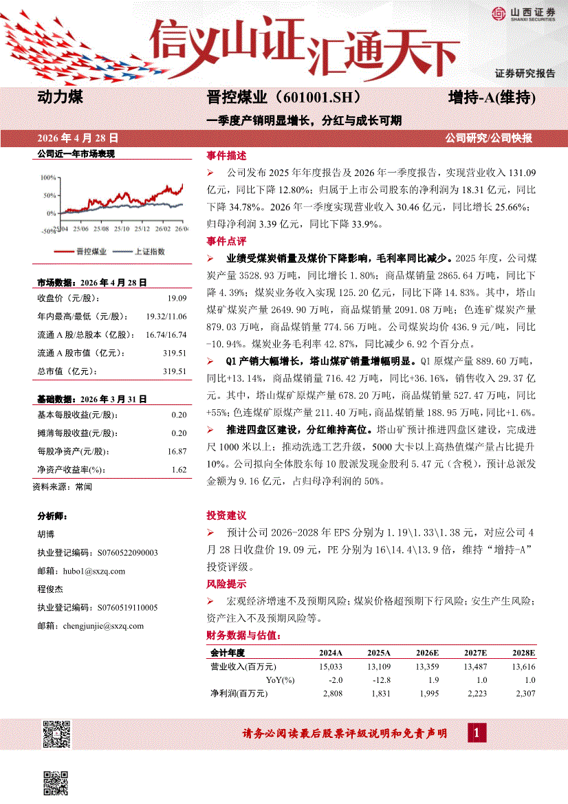 晋控煤业:山西证券-晋控煤业-601001-一季度产销明显增长,分红与成长可期-260428