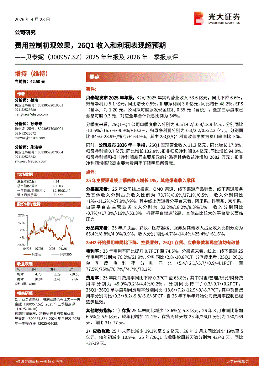 贝泰妮:光大证券-贝泰妮-300957-2025年年报及2026年一季报点评:费用控制初现效果,26Q1收入和利润表现超预期-260428