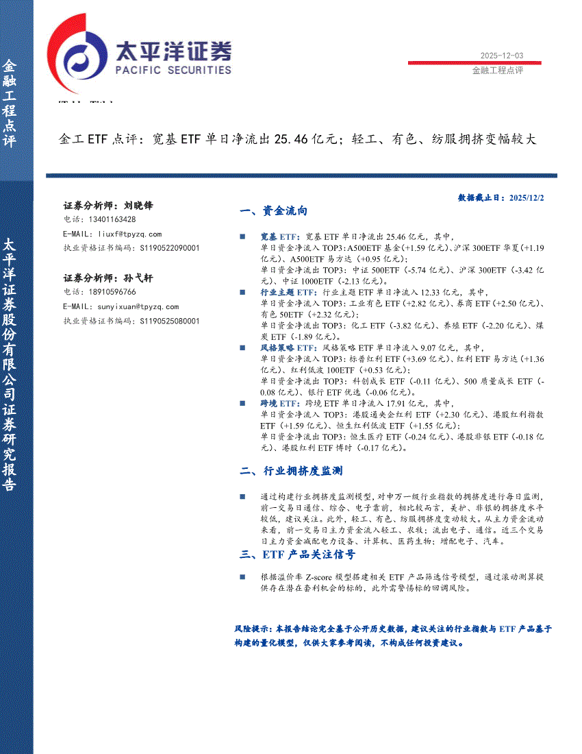 太平洋证券-金工ETF点评:宽基ETF单日净流出25.46亿元;轻工、有色、纺服拥挤变幅较大-251203
