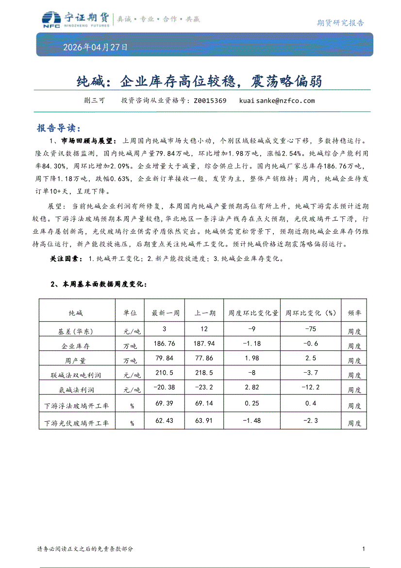 宁证期货-纯碱:企业库存高位较稳,震荡略偏弱-260427