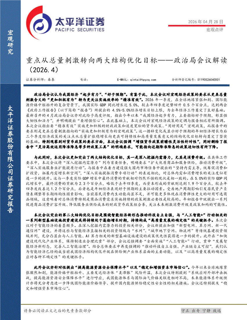 太平洋证券-政治局会议解读(2026.4):重点从总量刺激转向两大结构优化目标-260428