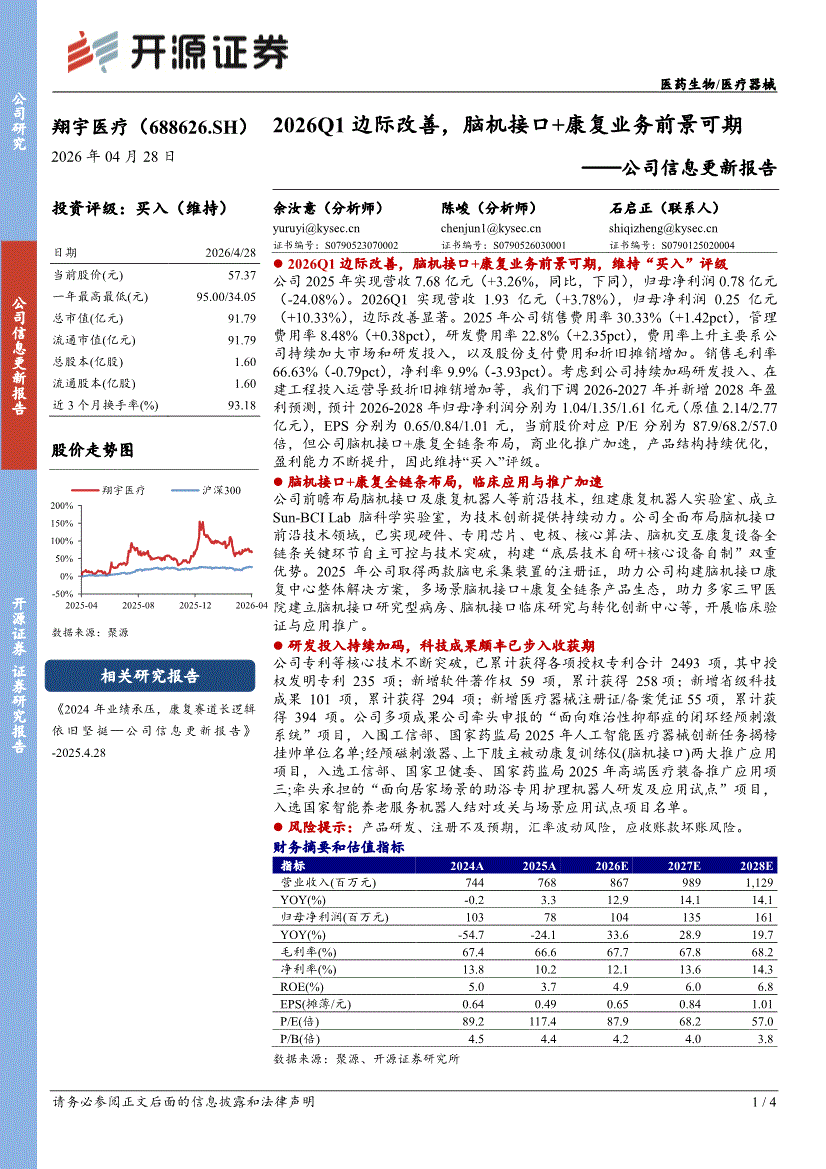 翔宇医疗:开源证券-翔宇医疗-688626-公司信息更新报告:2026Q1边际改善,脑机接口+康复业务前景可期-260428