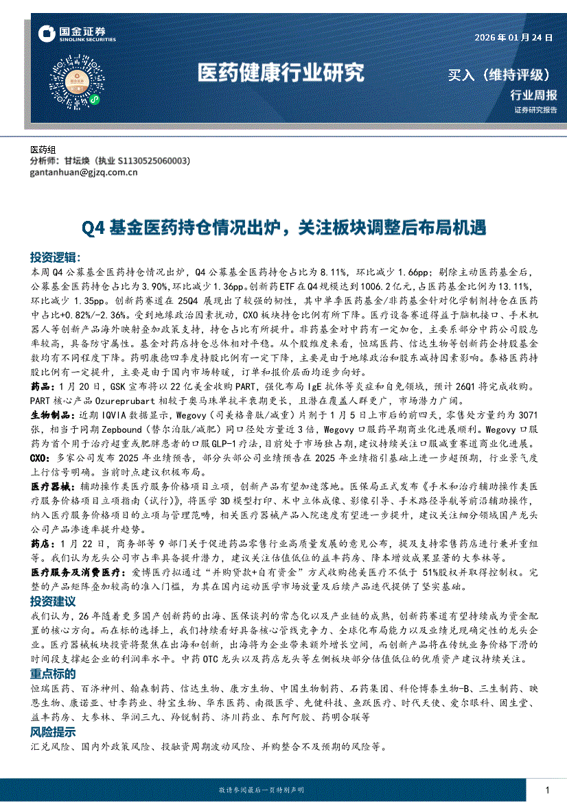 医药健康行业:国金证券-医药健康行业周报:Q4基金医药持仓情况出炉,关注板块调整后布局机遇-260124