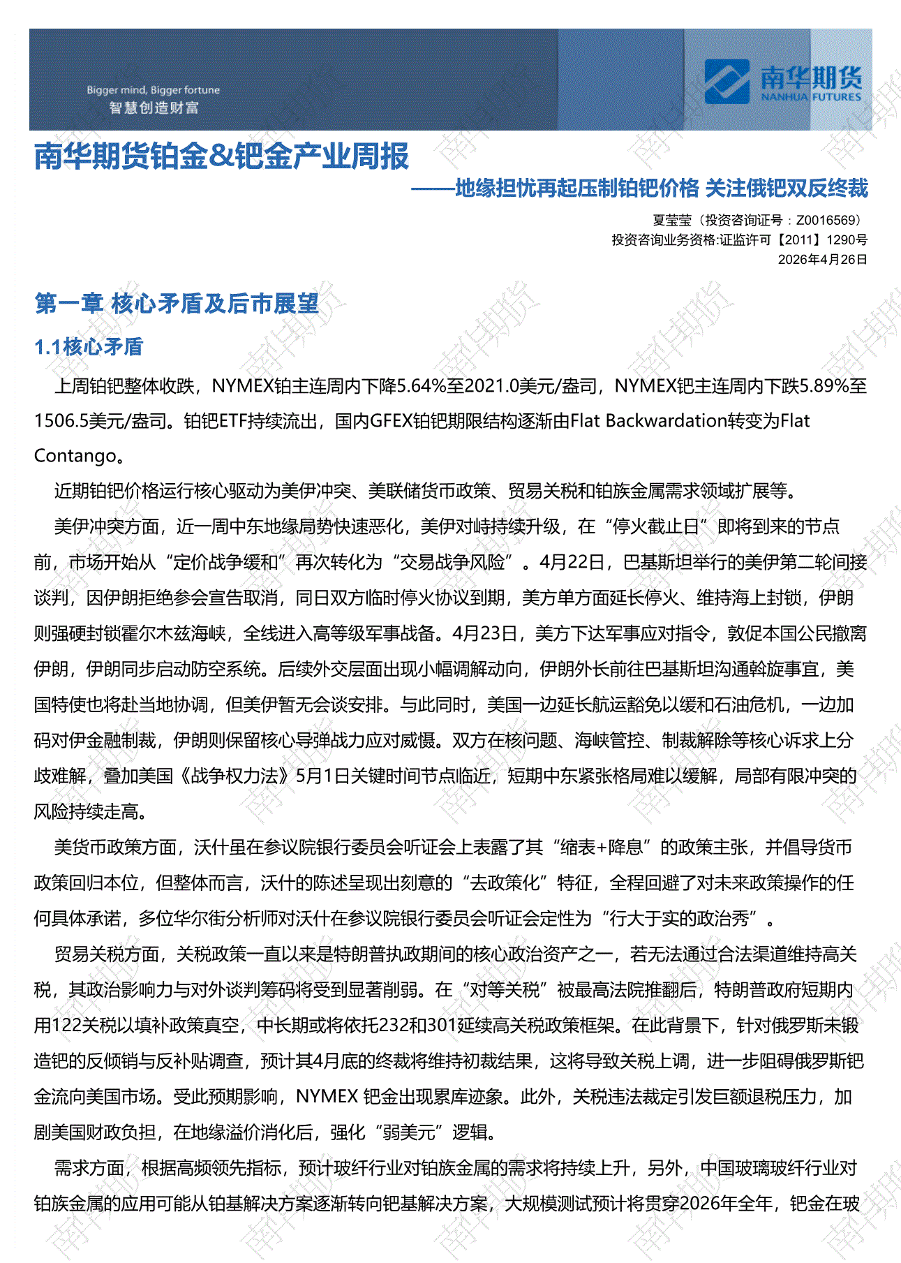 南华期货-铂金&钯金产业周报:地缘担忧再起压制铂钯价格,关注俄钯双反终裁-260426
