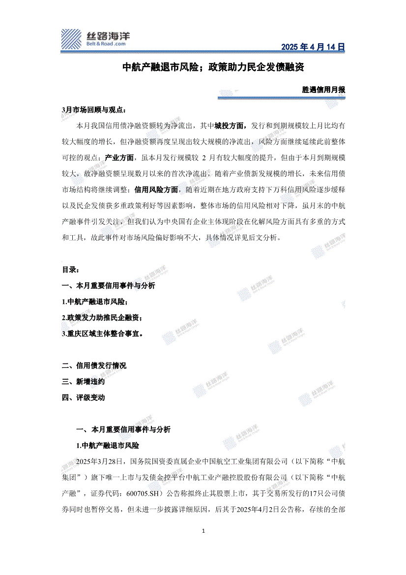 丝路海洋-胜遇信用月报:中航产融退市风险;政策助力民企发债融资-250414