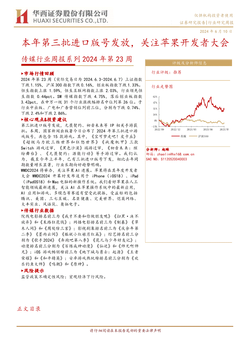 传媒行业:华西证券-传媒行业周报系列2024年第23周:本年第三批进口版号发放,关注苹果开发者大会-240610