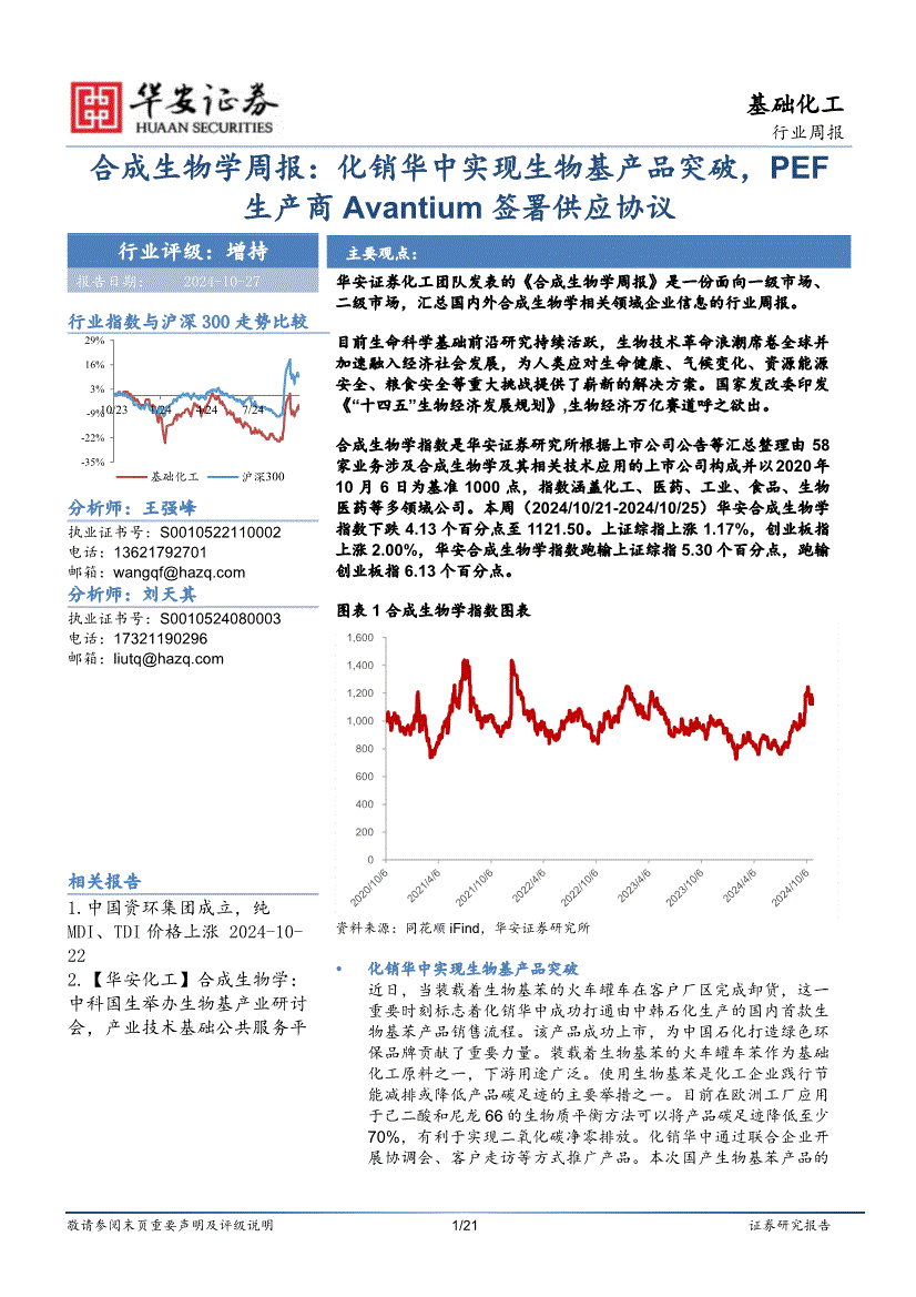 基础化工行业:华安证券-基础化工行业周报:合成生物学周报,化销华中实现生物基产品突破,PEF生产商Avantium签署供应协议-241027
