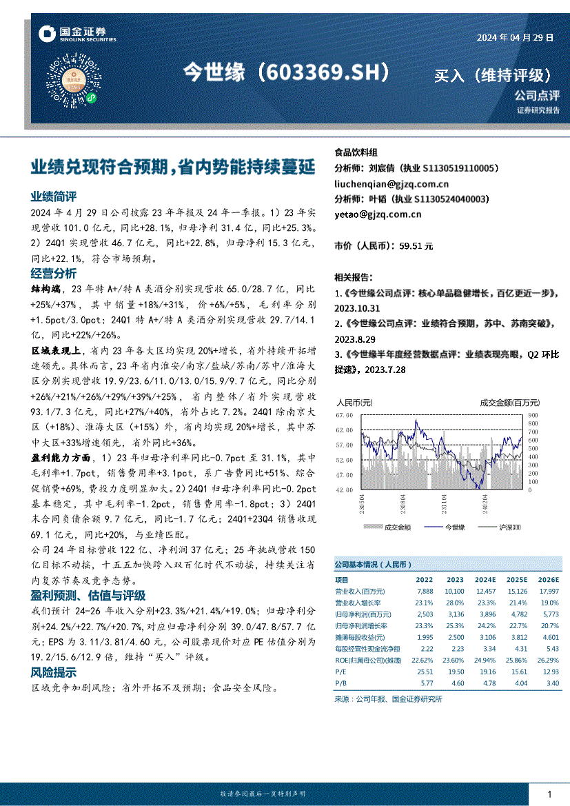 今世缘:国金证券-今世缘-603369-业绩兑现符合预期,省内势能持续蔓延-240429
