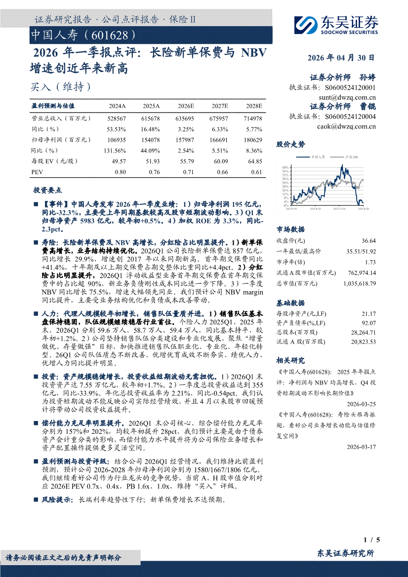 中国人寿:东吴证券-中国人寿-601628-2026年一季报点评:长险新单保费与NBV增速创近年来新高-260430