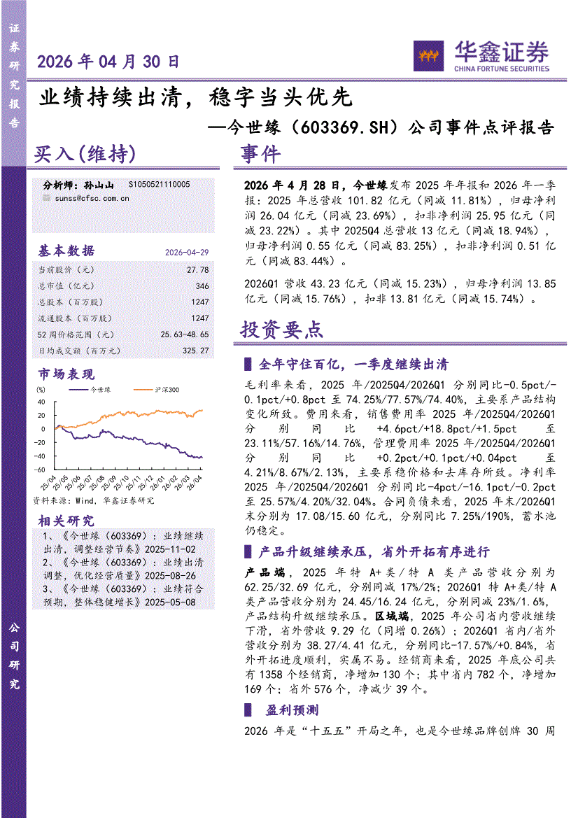 今世缘:华鑫证券-今世缘-603369-公司事件点评报告:业绩持续出清,稳字当头优先-260430