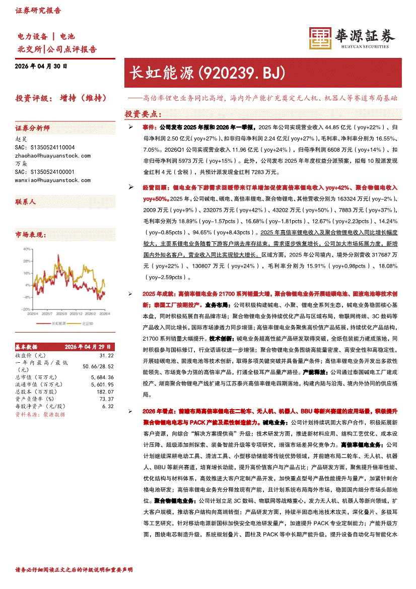 长虹能源:华源证券-长虹能源-920239-高倍率锂电业务同比高增,海内外产能扩充奠定无人机、机器人等赛道布局基础-260430
