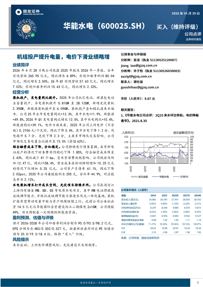 华能水电:国金证券-华能水电-600025-机组投产提升电量,电价下滑业绩略增-260429