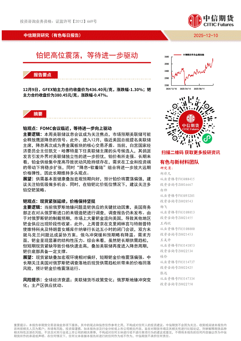 中信期货-有色每日报告:铂钯高位震荡,等待进一步驱动-251210