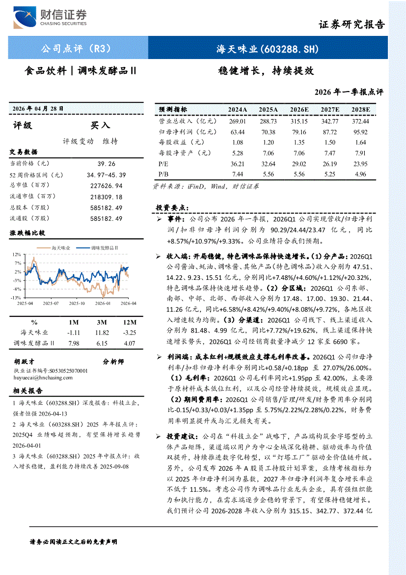 海天味业:财信证券-海天味业-603288-2026年一季报点评:稳健增长,持续提效-260428