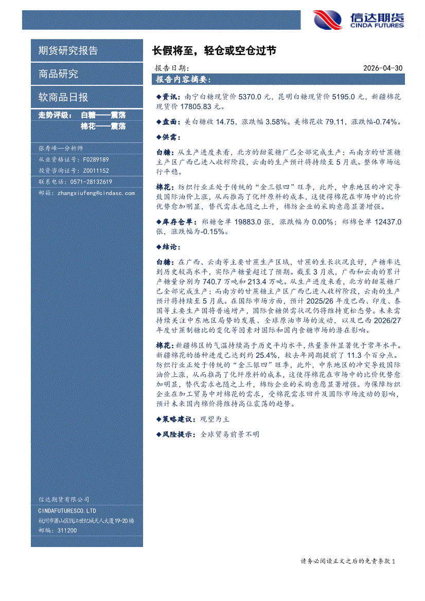 信达期货-软商品日报:长假将至,轻仓或空仓过节-260430