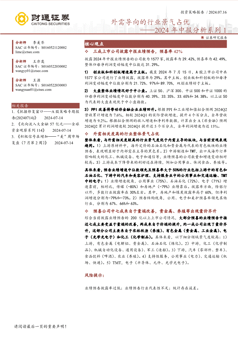 财通证券-2024年中报分析系列1:外需导向的行业景气占优-240716