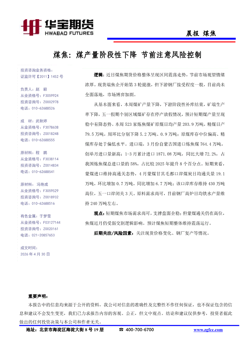 华宝期货-煤焦晨报:煤产量阶段性下降,节前注意风险控制-260430
