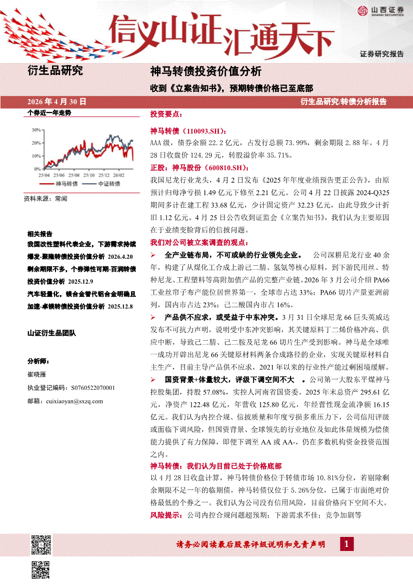 山西证券-神马转债投资价值分析:收到《立案告知书》,预期转债价格已至底-260430