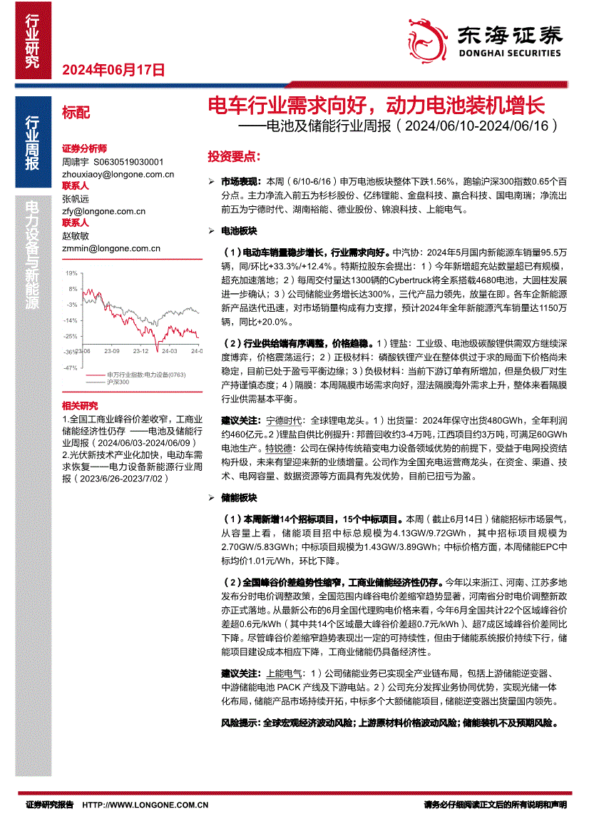 电力设备与新能源行业:东海证券-电池及储能行业周报:电车行业需求向好,动力电池装机增长-240617
