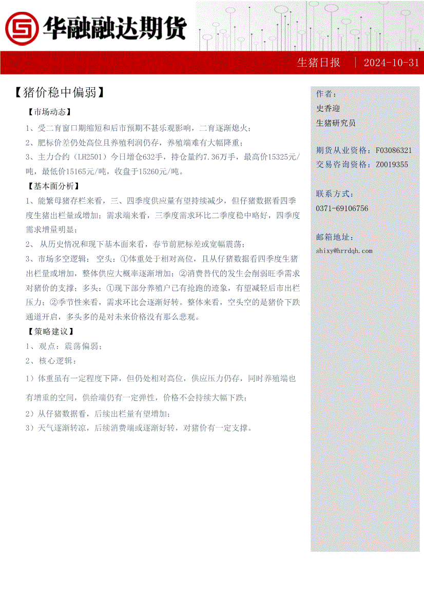 华融融达期货-生猪日报:猪价稳中偏弱-241031