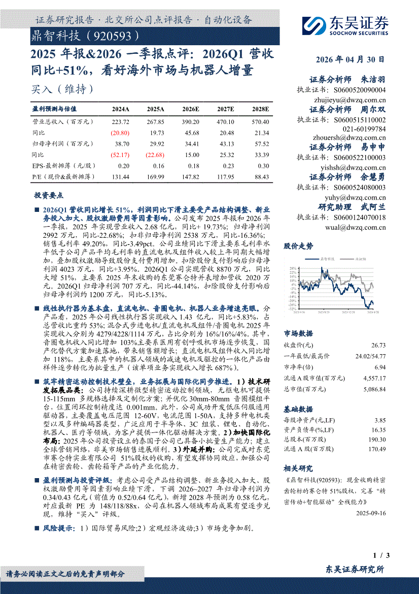 鼎智科技:东吴证券-鼎智科技-920593-2025年报&2026一季报点评:2026Q1营收同比+51%,看好海外市场与机器人增量-260430