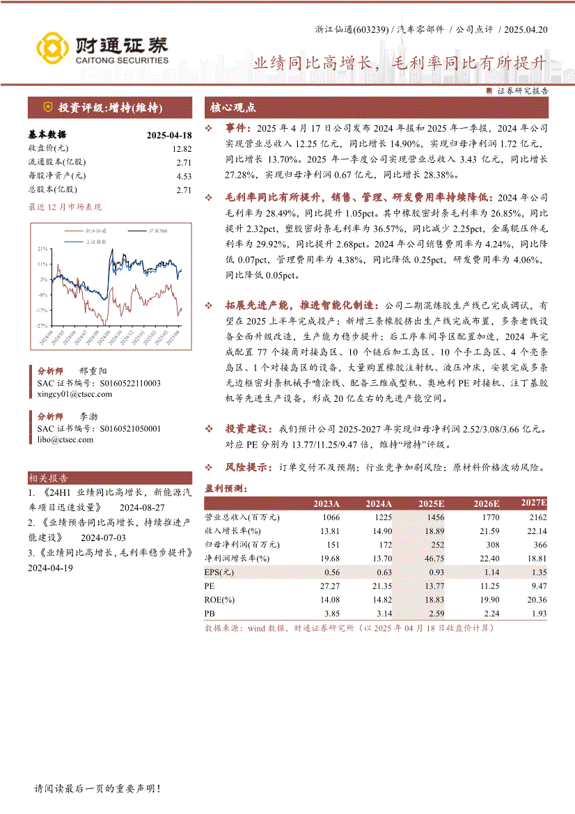 浙江仙通:财通证券-浙江仙通-603239-业绩同比高增长,毛利率同比有所提升-250420