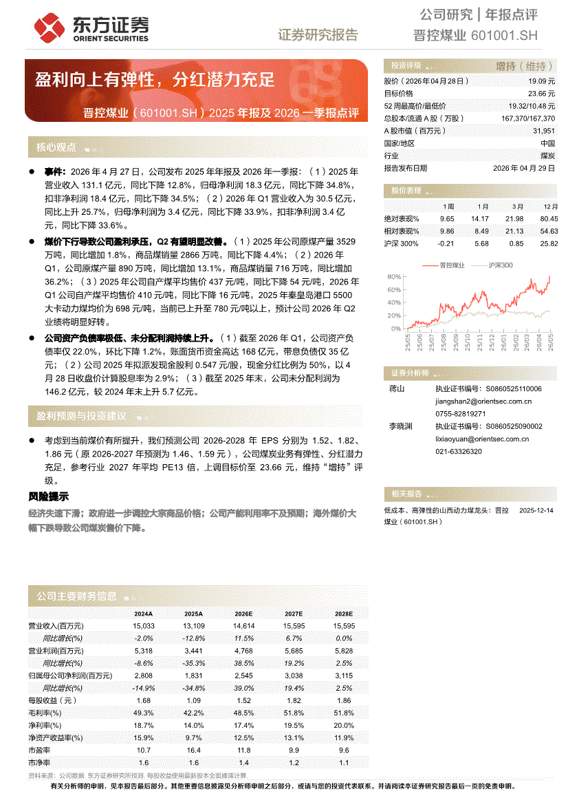 晋控煤业:东方证券-晋控煤业-601001-2025年报及2026一季报点评:盈利向上有弹性,分红潜力充足-260429