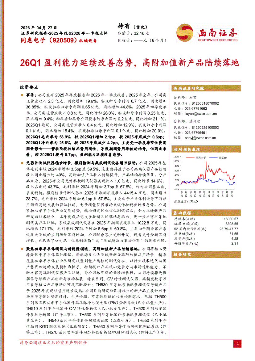 同惠电子:西南证券-同惠电子-920509-26Q1盈利能力延续改善态势,高附加值新产品陆续落地-260427